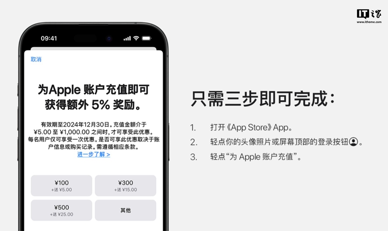 苹果官方页面显示,用户充值金额需介于 ¥5.00 至 ¥1,000.00 之间时,可享受此优惠。每名用户仅可享受一次优惠。优惠随时可能终止,需遵循相应条款。
