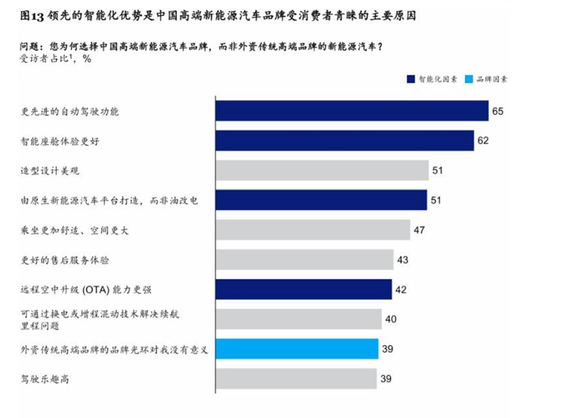 首先,智能驾驶正在从“选配”迈向“标配”。根据《2024 麦肯锡中国汽车消费者洞察》,在其中关于中国消费者选择高端新能源汽车品牌原因的调查中,选择“更先进的自动驾驶功能”的用户占比达到了 65%,位列第一。