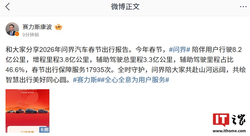 赛力斯副总裁康波近日晒出2026问界汽车春节出行报告,其中辅助驾驶总里程达3.3亿公里,占总行驶里程的46.6%。作为赛力斯在智能驾驶应用成果上的主动披露,该报告基于春节期间真实用户行驶数据统计,面向行业与公众展示问界汽车辅助驾驶功能的使用广度与渗透率,在智能汽车与自动驾驶领域引起讨论,被视为车企以实证数据呈现辅助驾驶普及程度的案例。据官方消息,此次数据汇总覆盖问界多款车型在春节假期的行驶记录,旨在反映辅助驾驶在日常长途与跨区域出行中的实际应用情况。