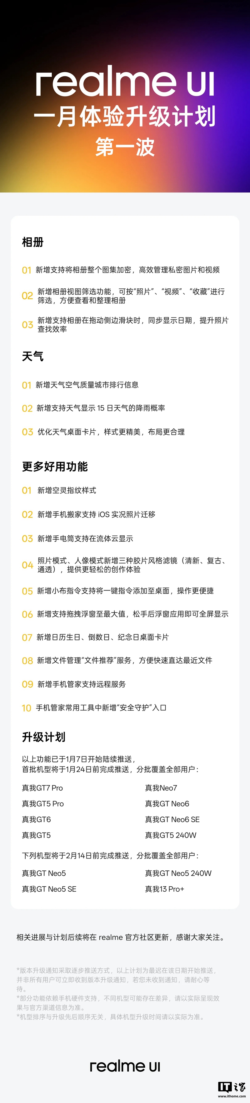 1 月 12 日消息,真我官方本周(1 月 10 日)发布了 realme UI 更新预告,官方计划 1 月 13 日-1 月 19 日为真我 GT7 Pro、GT Neo5 等十款机型提供更新。