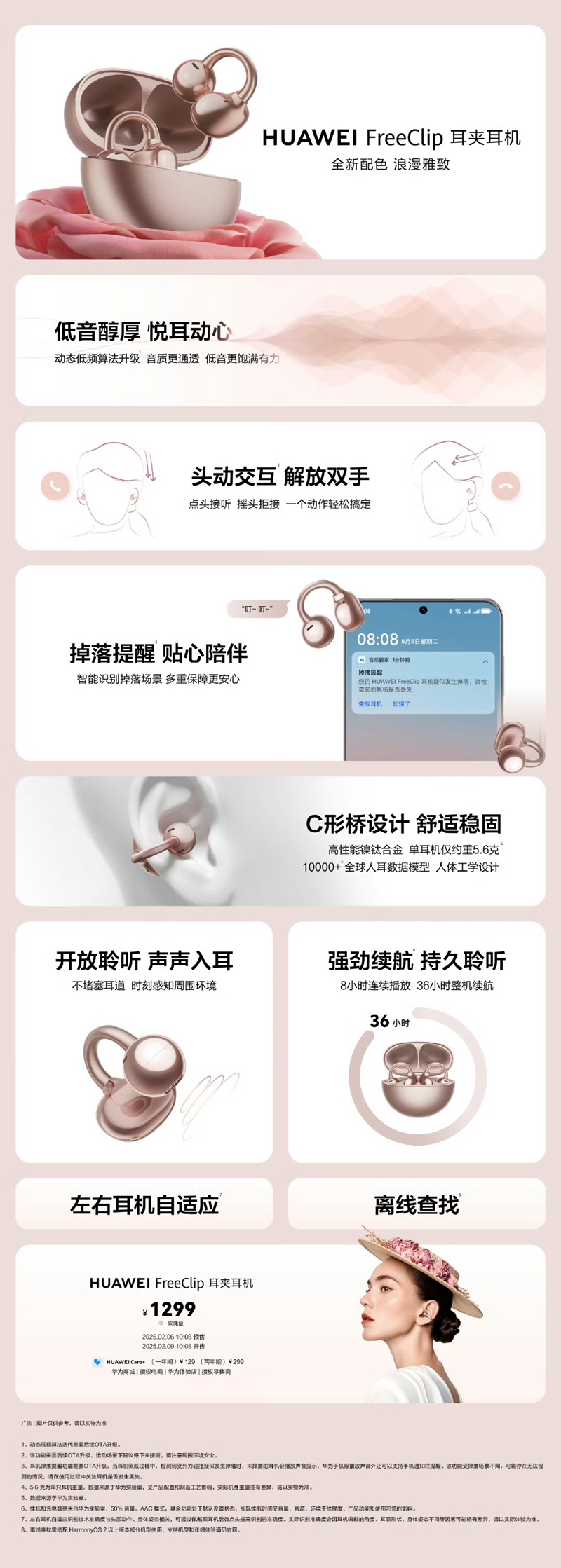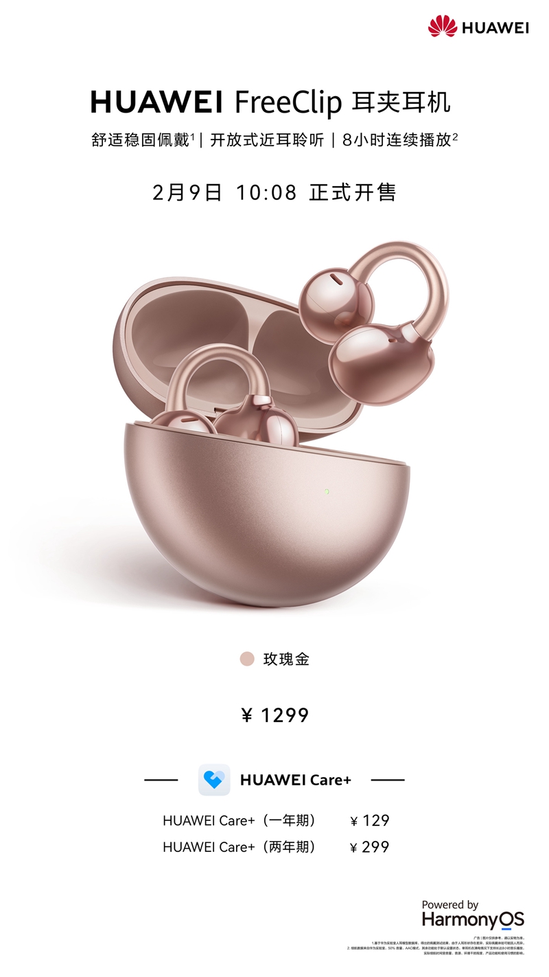 2 月 9 日消息,华为 FreeClip 耳夹耳机增加全新玫瑰金配色,新增头动交互、掉落提醒等功能,今日(2 月 9 日)10:08 正式开售,价格为 1299 元,京东首销优惠 50 元,到手价 1249 元。
