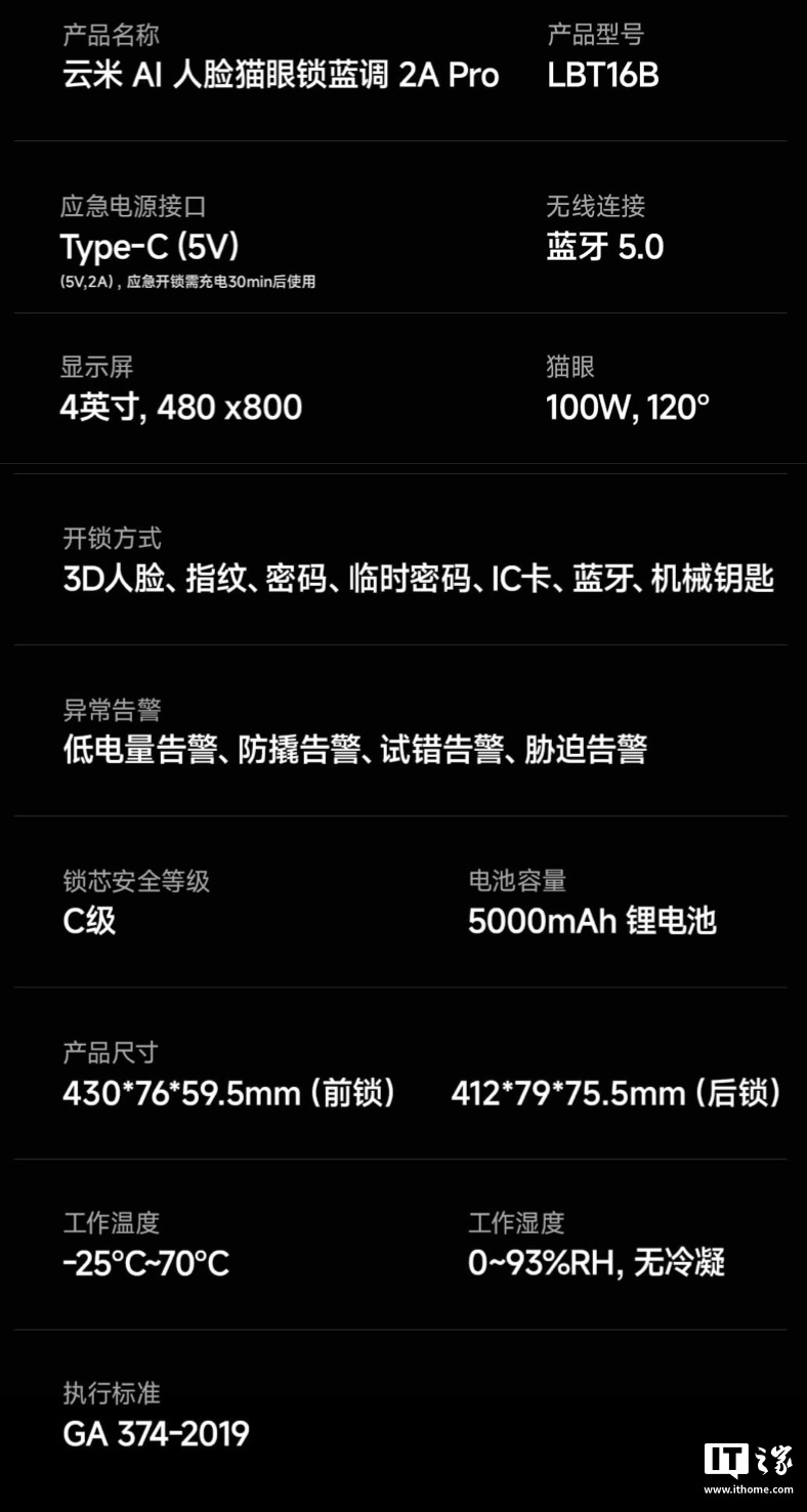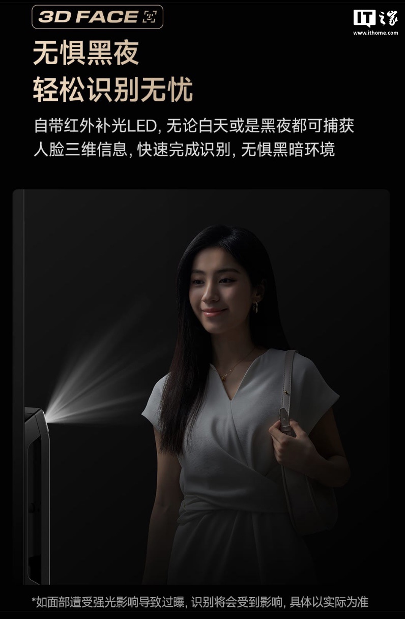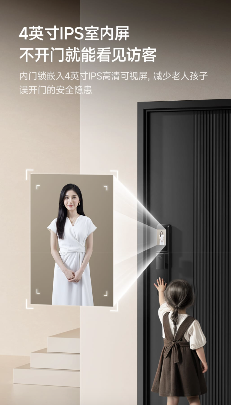 据介绍,这款人脸门锁搭载 3D 结构光人脸识别技术,同时自带红外补光 LED、微波雷达人体感应,人脸识别距离 0.3-1 米,身高覆盖范围 1.2-2 米,门锁内部配有 4 英寸 IPS 面板便于用户操作互动。