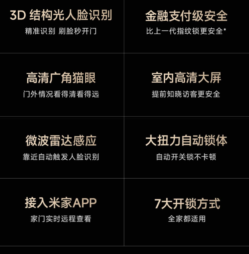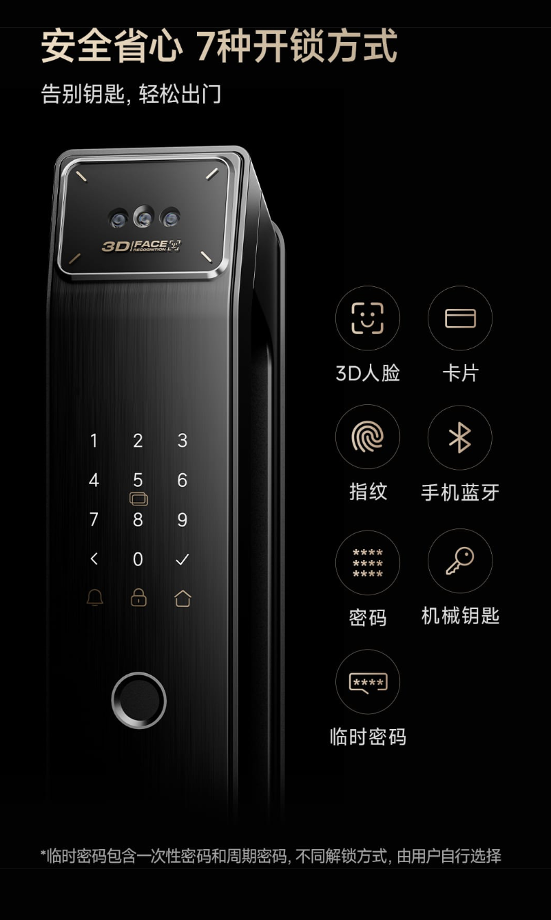 该门锁支持 3D 人脸、指纹、手机蓝牙、卡片、密码、机械钥匙开门,同时也接入了米家 App,支持开门智能家居联动。