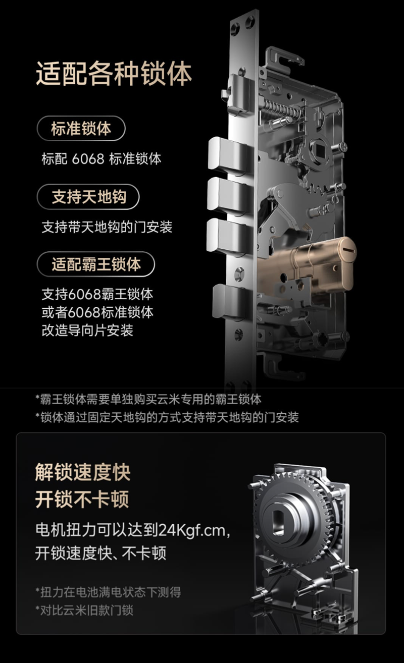兼容性方面,该门锁适配标准 6068 锁体、支持天地钩、支持霸王锁体(需要单独购买云米专用的霸王锁体)。