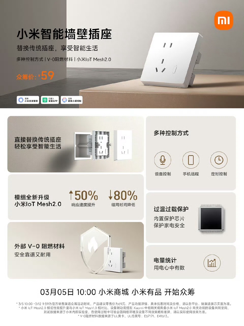 3 月 3 日消息,小米官方今日预告了一款全新升级小米 IoT Mesh 2.0 的“小米智能墙壁插座”,将于 3 月 5 日开启众筹,众筹价 59 元。