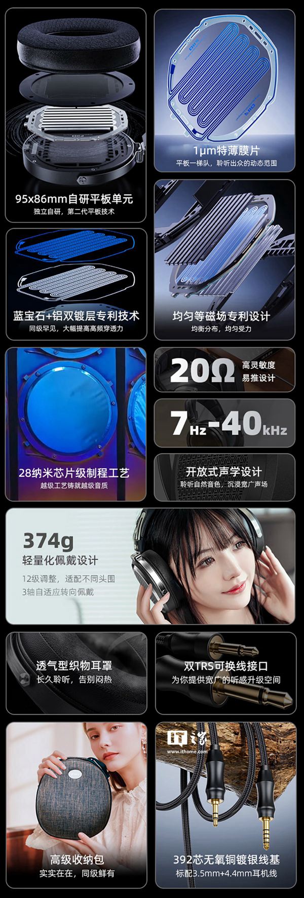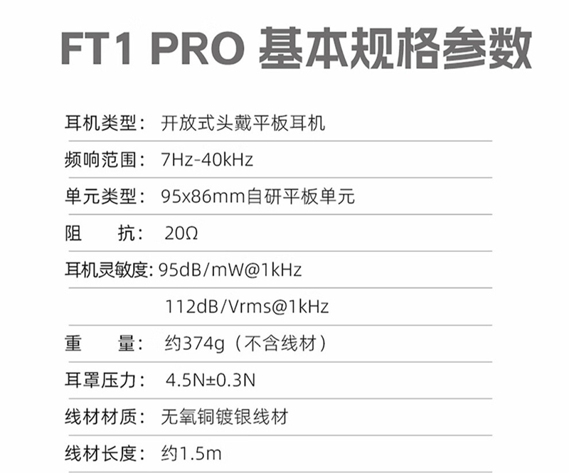 该耳机搭载 95x86mm 第二代自研平板单元、采用 20Ω 低阻抗设计、频响范围 7Hz~40kHz。耳机通过 Hi-Res 金标认证,配备双 3.5mm TRS 接口,采用可换线设计,适用于线材升级。耳机标配收纳包与 2 条无氧铜镀银耳机线(3.5mm 单端、4.4mm 平衡)。