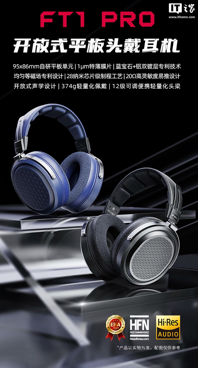 3 月 25 日消息,飞傲宣布旗下 FT1 Pro 开放式平板头戴耳机新增一款蓝色版上市,该耳机配备“第二代自研平板单元”、重约 374g,售价为 1299 元。