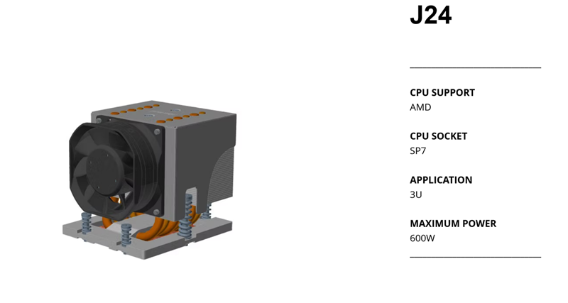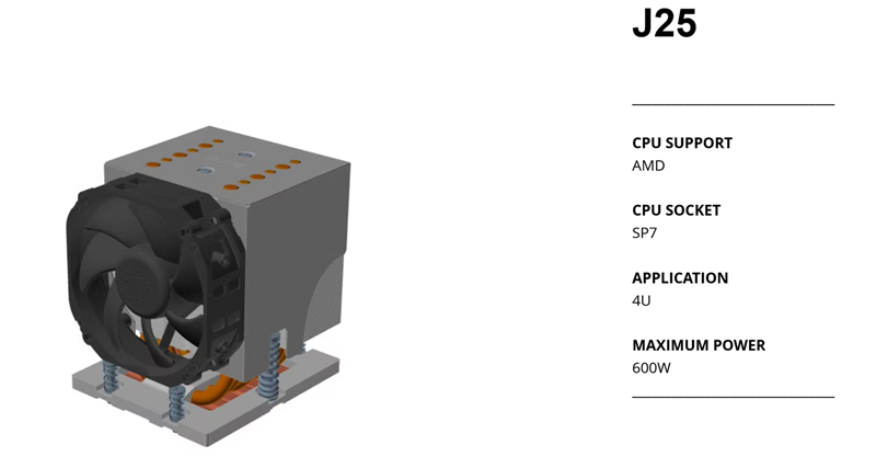 而对于 AMD SP7 平台,Dynatron 则提供了分别适用于 3U 和 4U 高度的 J24 和 J25 塔式风冷,两者标称解热能力均为 600W。