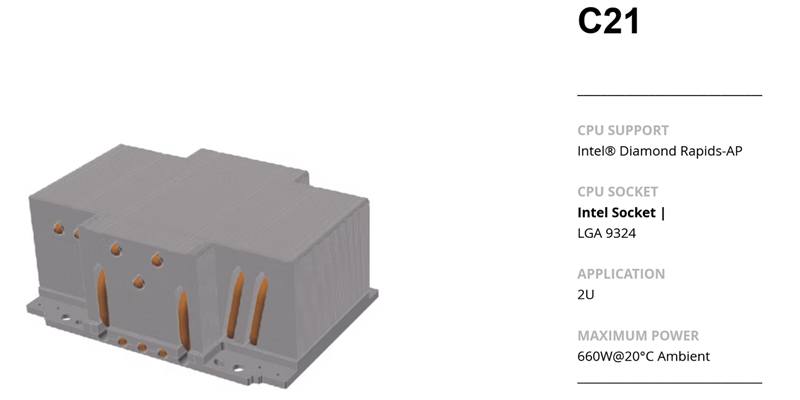 其中在英特尔 FCLGA9324 平台方面,Dynatron 带来了依赖服务器风道的 2U 高度兼容散热器 C21。C21 明确支持英特尔 Diamond Rapids-AP 处理器,配备铝铜混合底座 + 九根热管 + 铝鳍片组,在 20℃ 的环境温度下具备 660W 解热能力。