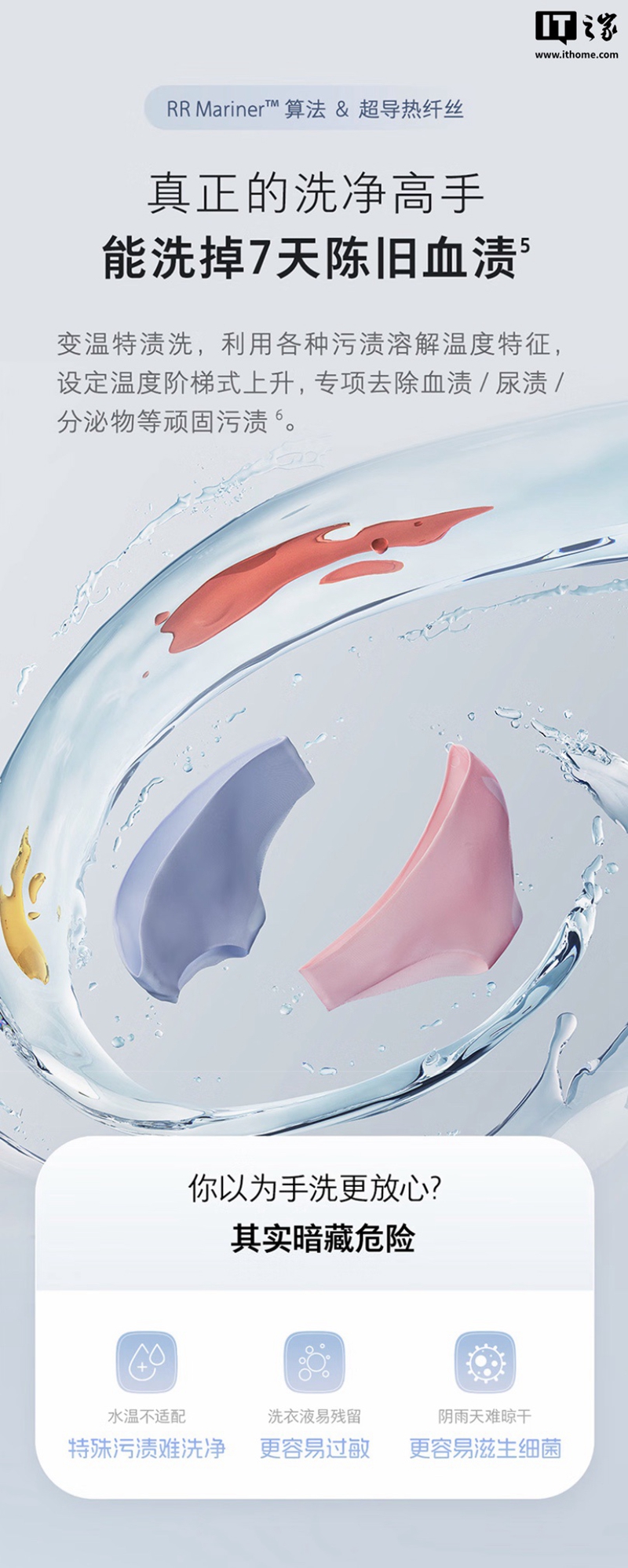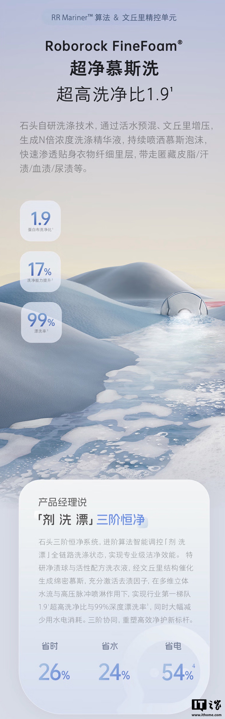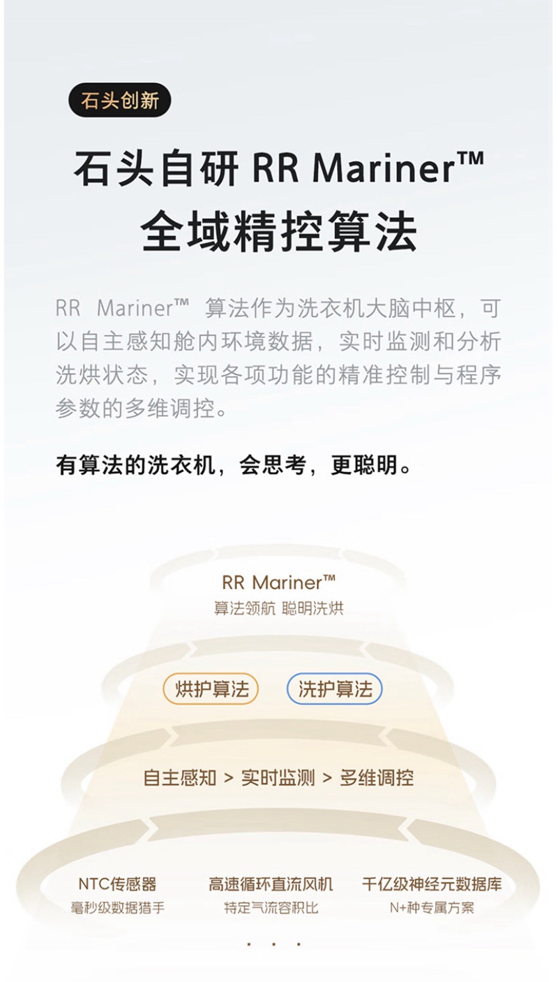 据介绍,这款迷你洗烘一体机搭载石头自研 RR MARiner 全域精控算法,拥有“超净慕斯洗”洗涤技术,号称可通过“活水预混、文丘里增压”,生成高浓度洗涤精华液,可高效清洗皮脂 / 汗渍 / 血渍 / 尿渍等。