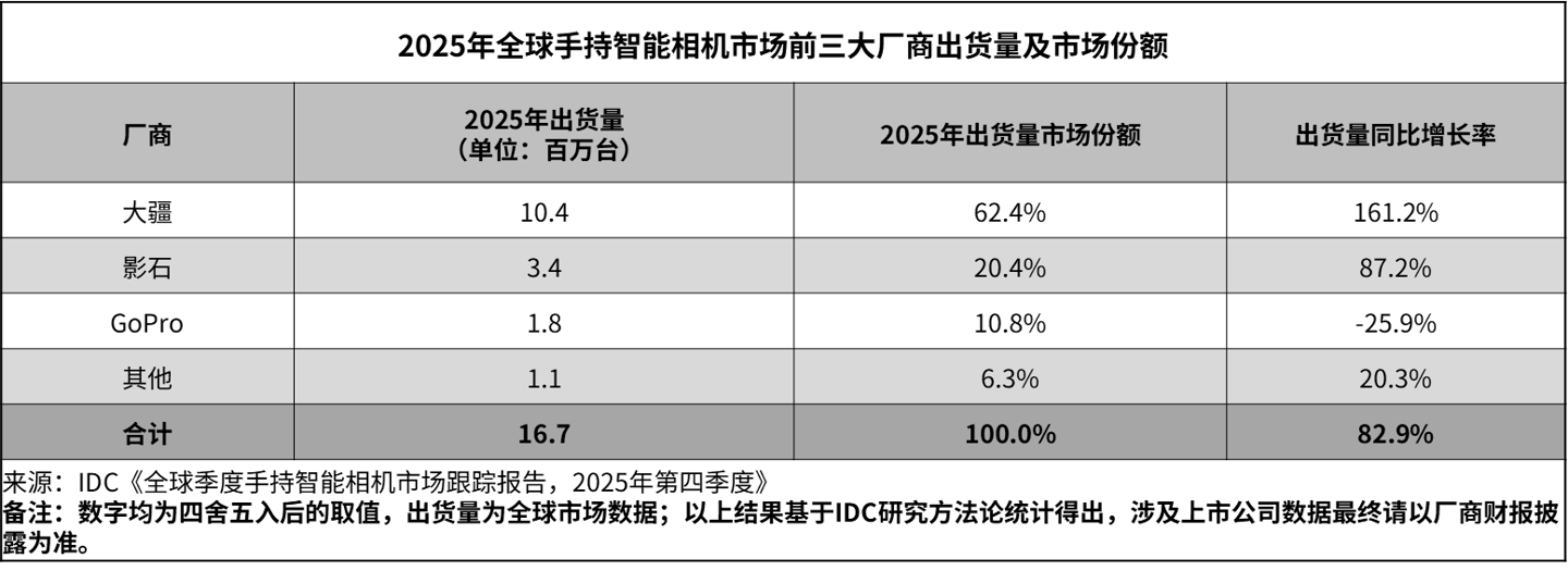 市场研究机构IDC预测,2025年全球手持相机出货量预计同比增长83%,主要受户外运动、短视频创作与直播需求拉动。大疆、影石Insta360与GoPro在出货量及市场占有率方面位居前三,分别凭借航拍稳定、全景拍摄与极限运动防抖等技术优势占据细分领域主导地位。手持相机在专业层面强调防抖算法、高帧率视频与广角低畸变光学设计,以适配多变环境与创作场景。