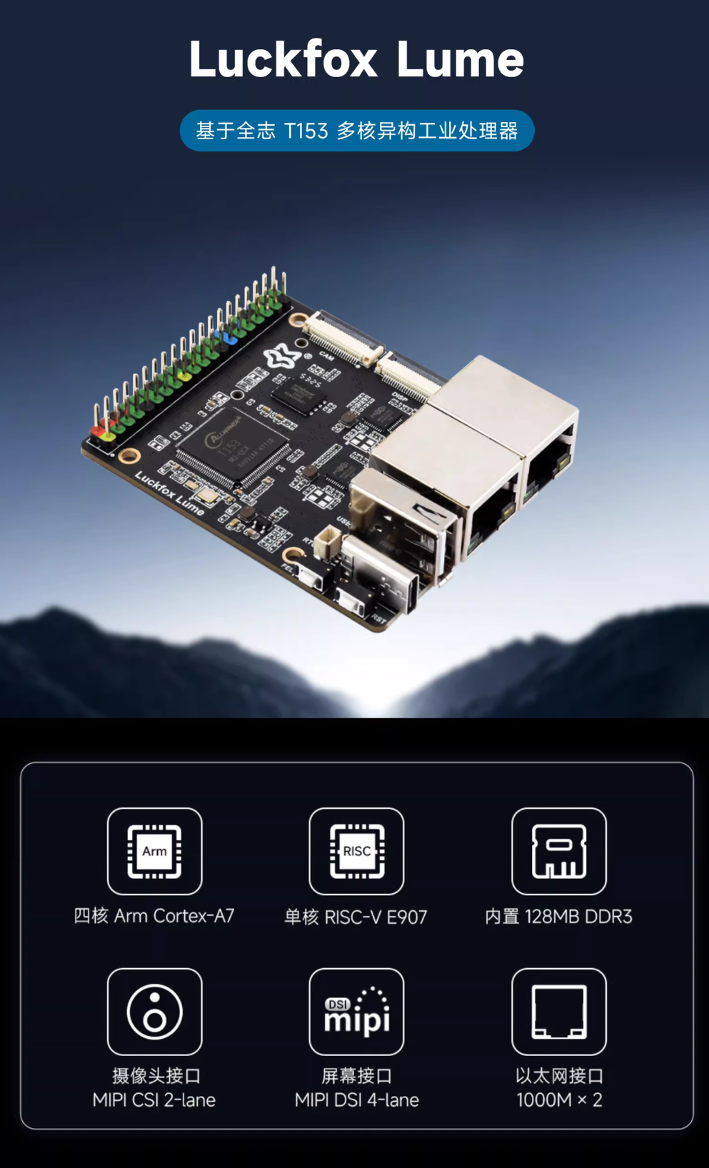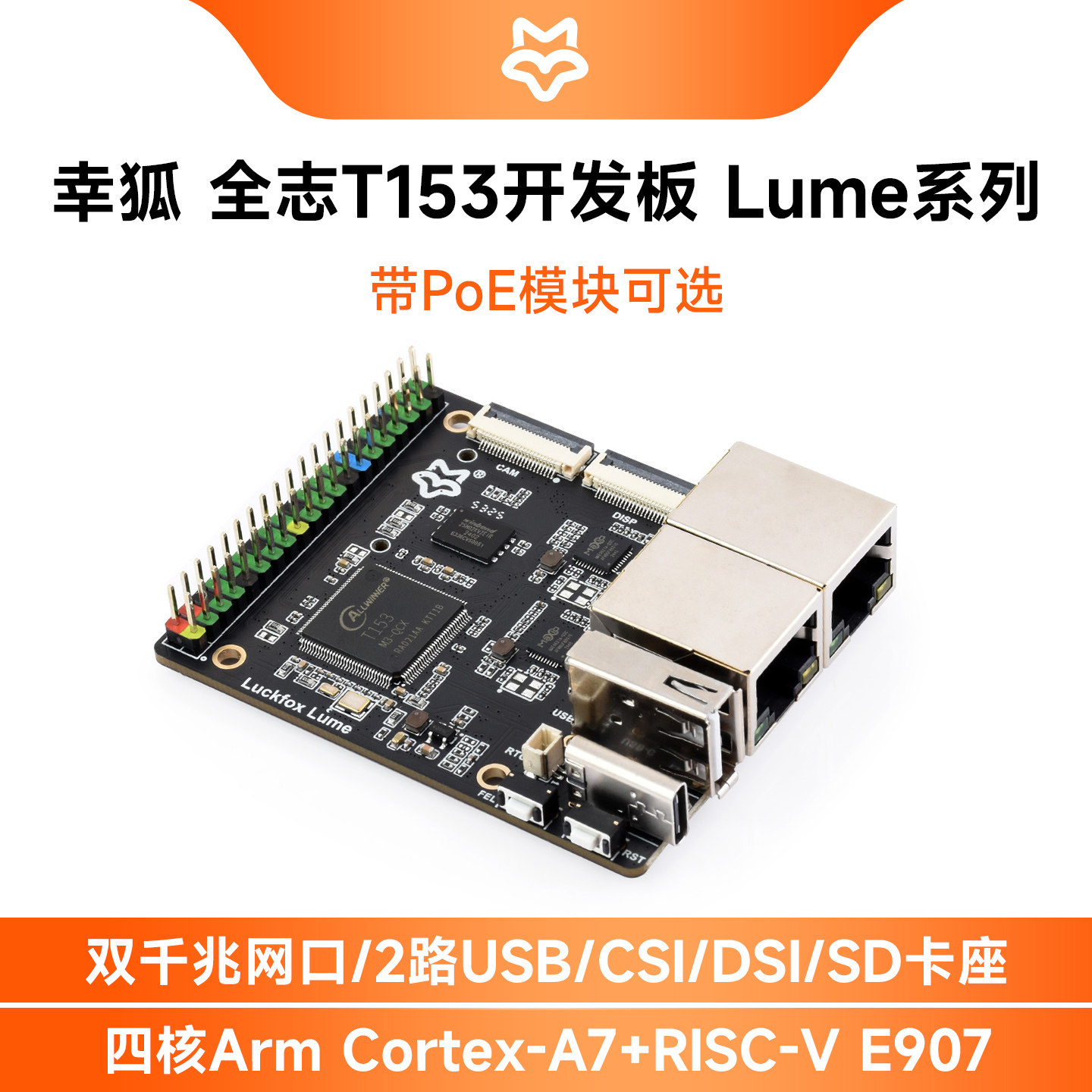 幸狐推出Lume系列Linux开发板,核心搭载全志T153多核异构处理器,集成4颗Cortex-A7与1颗RISC-V E907核心,板载128MB DDR3内存,面向物联网与边缘计算场景优化。开发板提供MIPI DSI与CSI接口,可直连显示屏与摄像头模块,配备双千兆以太网口,可选配PoE供电模块,另设USB 2.0 Type-C及Type-A接口与microSD卡槽,满足多介质数据接入与外设扩展需求。标准版售价129元,含PoE模块套餐售价159元,定位高性价比网络与边缘节点控制器。