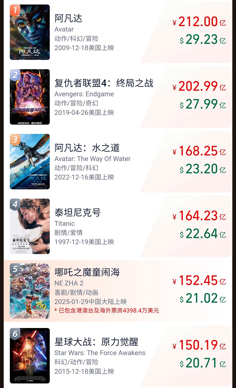 《哪吒之魔童闹海》于今年春节档上映,昨日官方宣布延长上映至 4 月 30 日,此前曾在 2 月 19 日宣布延长上映至 3 月 30 日。截至发稿,电影《哪吒之魔童闹海》全球累计票房达 152.45 亿元(包含港澳台及海外票房 4398.4 万美元),位居影史第五。