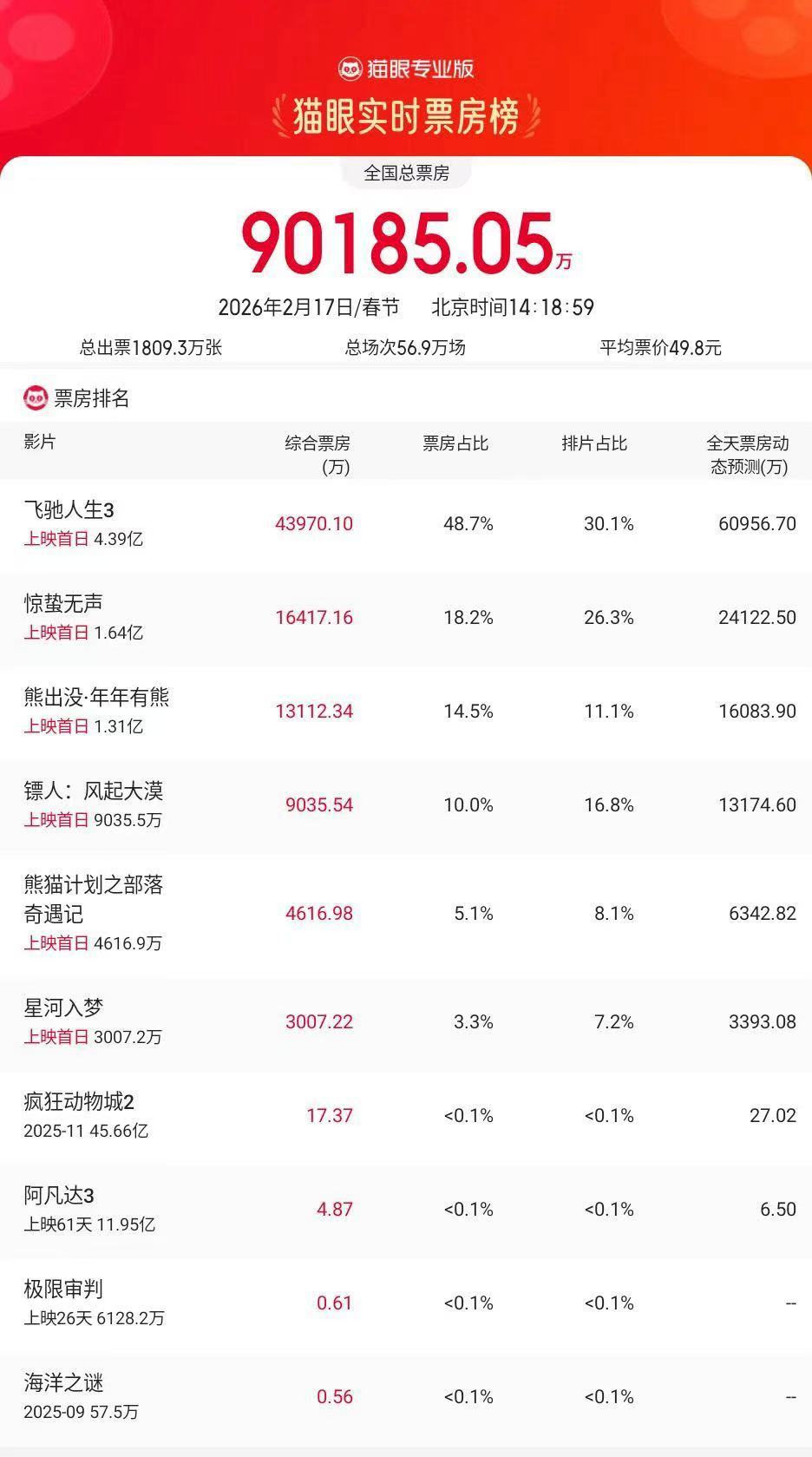 据网络平台数据,截至2月17日13时04分,2026年中国内地春节档(2月15日—2月23日)总票房(含预售)突破10亿元。档期内,《飞驰人生3》以约4.55亿元票房暂列第一,《惊蛰无声》以约1.72亿元紧随其后,《熊出没·年年有熊》以约1.29亿元位居第三,三部影片共同领跑春节档。