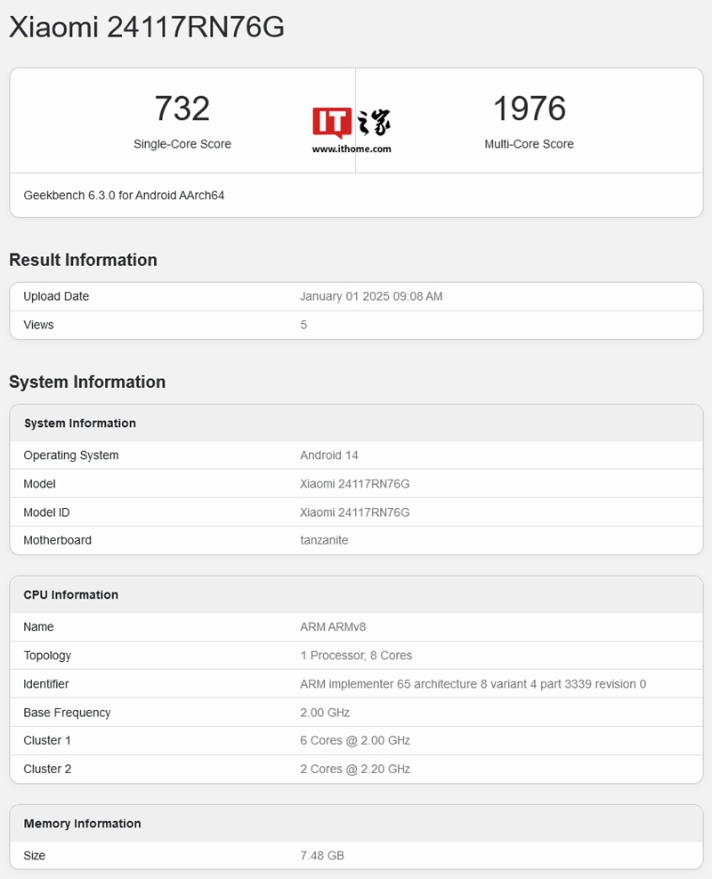该机型号为 24117RN76G,末尾的“G”代表国际版本。该机运行安卓 14 系统,配备 8GB RAM(Geekbench 显示为 7.48GB),预计正式发布时可能提供更多内存选项。