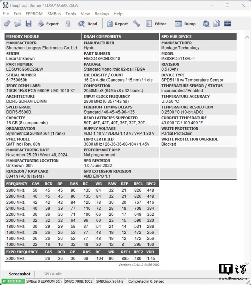 首先通过 ThAIphoon Bunne 台风软件对它的内存颗粒信息进行读取,在生产商一栏写有 ShenZhen Longsys Electronics Co.Ltd,也就是深圳江波龙电子股份有限公司。内存颗粒为海力士,A Die 颗粒,速率等级一栏的基础速率为 DDR5 5600,EXPO 运行规格为 3000MHz /26-36-36-68-104/1.45V,支持 EXPO 技术。