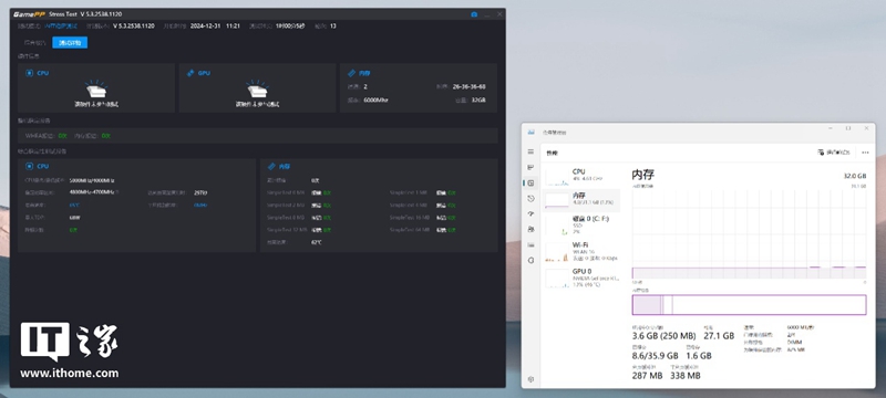 当然,超频环节还需要进行内存稳定性测试,毕竟大家买内存回去可不是为了跑分好看,所以也通过游戏加加的内存稳定性测试对调整小参和超频状态下的内存进行检验,结果在 1 小时累计 13 轮循环内存烧机后,调整小参的雷克沙战神之翼 ARES RGB DDR5 6000 内存实现 0 报错,顺利通过测试;而 6400MHz C28 的超频模式在第 3 轮循环时出现报错,建议大家日常使用还是保持在 6000MHz 运行。