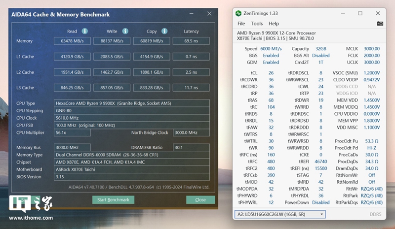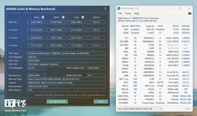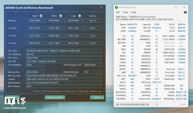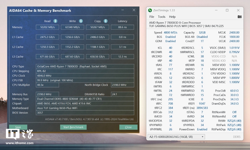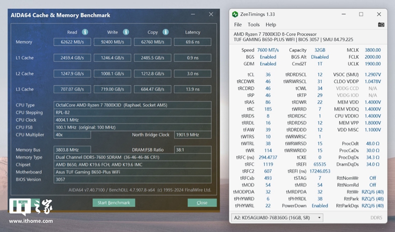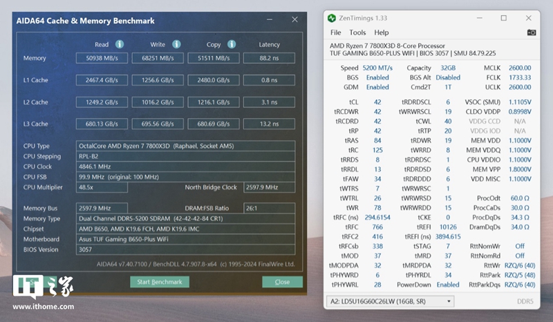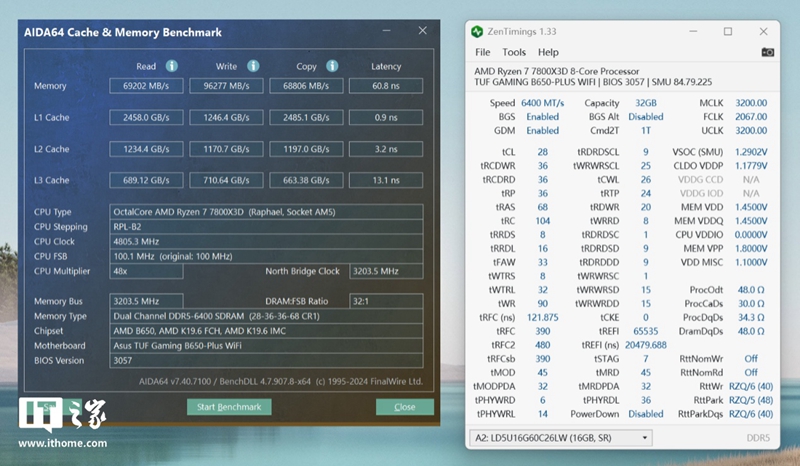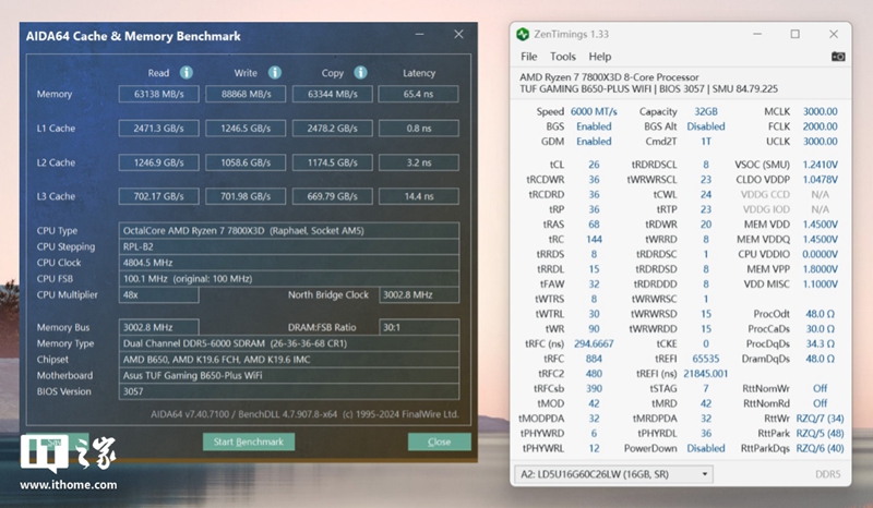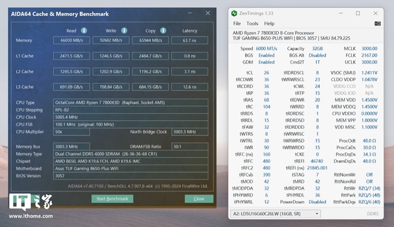 另外要提一点,虽然本次测试基于锐龙 7 7800X3D 处理器 + 华硕 TUF B650 GAMING PLUS 主板这个配置组合,但我们也简单测了下更高频率的异步模式和另外两套更高配置(锐龙 9 9900X + X870E / 锐龙 7 9800X3D + X870E)的表现。