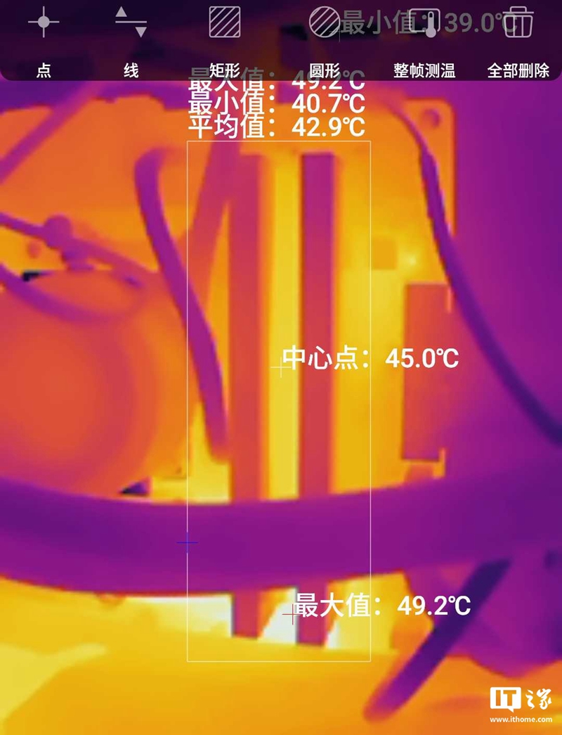 与此同时,我们还通过测温设备对 AIDA64 内存跑分时的内存表面温度进行了测试,每个游戏测一次,取四次中的最高值,测温设备选择专业模式下的局部测温,尽量减少测试误差。其中 AIDA64 跑分时内存表面最高温度为 49.2 度,平均温度为 45 度。