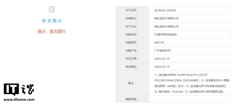 3 月 23 日消息,型号为“NX779J”努比亚新机已现身电信设备终端网,并通过工信部电信设备进网审核。新机支持 NR SA / NR NSA / TD-LTE/ LTE FDD / WCDMA / CDMA 1X / GSM 制式、5G-增强移动宽带(eMBB)技术、5G 异网漫游功能等。