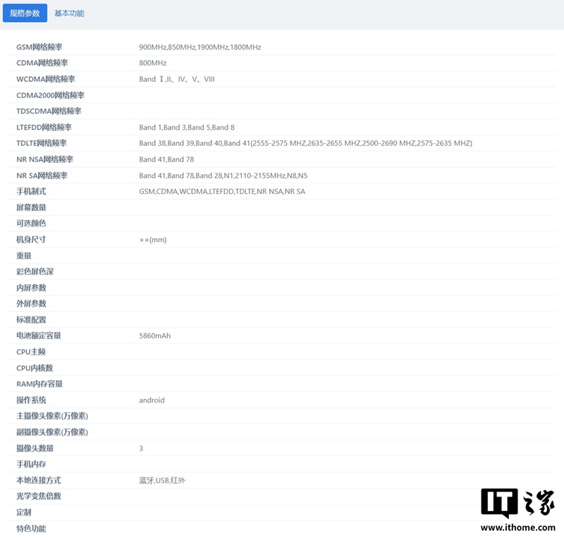 电信设备终端网显示,努比亚“NX779J”手机配备 5860mAh 电池、预装安卓系统,配备三颗摄像头(具体配置情况未说明),产品特点包括:全网通、NFC、双卡双待等。