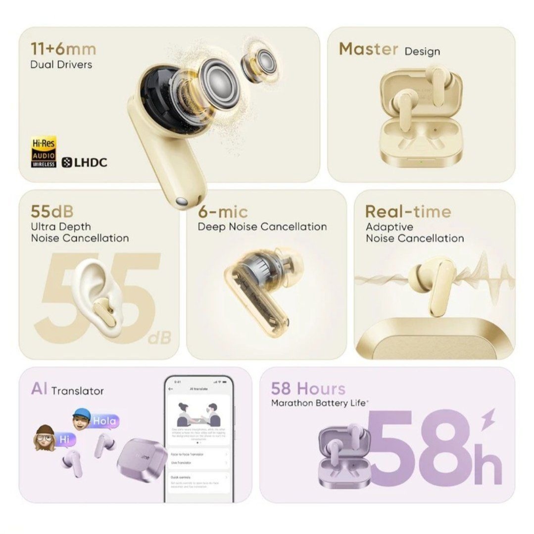 真我 Buds Air8 预计采用升级版混合主动降噪方案,最大降噪深度可达 55dB,能有效过滤地铁、公交及街道等环境的低频与中高频噪音,配合智能环境音侦测,在不同场景下自动调节降噪强度,保持安静与安全的平衡。发声单元方面,搭载双动圈配置,通过不同尺寸振膜分工协作,扩展频响范围并提升细节解析力,使低频更饱满、中高频更清澈,满足流行、摇滚、古典等多种曲风的演绎需求。连接性能上,有望支持蓝牙 5.3 与低延迟协议,实现与手机、平板等设备的稳定快速配对,游戏与视频观看时音画同步更紧密。外观延续真我 Buds 系列的简约流线设计,提供多种清新配色,搭配符合人体工学的入耳结构,佩戴稳固且舒适,适合长时间使用。相比同价位单动圈或降噪深度不足的机型,真我 Buds Air8 在降噪能力、声音层次与佩戴体验上优势明显,精准解决用户“降噪深、音质丰、连接稳、戴着舒服”的核心诉求。