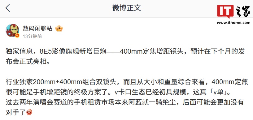 近日有消息称,vivo X300 Ultra作为蓝厂骁龙8E5影像旗舰机型,将在下月发布会上正式亮相,产品新增400mm定焦增距镜头配置。该机定位旗舰影像手机,搭载高通骁龙8E5处理器,主打长焦拍摄能力的进一步拓展,在关注移动影像突破的从业者与摄影爱好者中激起较多讨论。此信息目前尚未获官方确认,但已引发对旗舰手机长焦方案升级方向的探讨。