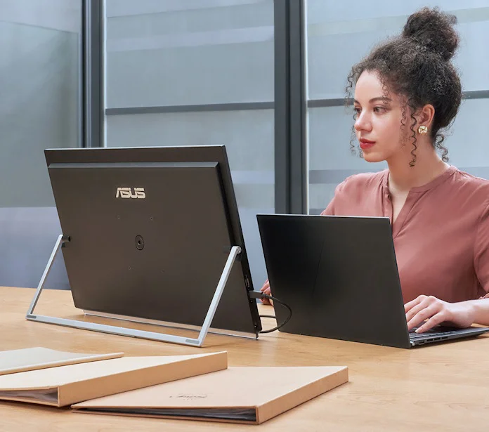 ZenScreen MB27ACF 厚度仅 5.4mm,整体质量不足 3kg,背部支架亦可作为提手使用,可在任意位置打造双屏办公空间。