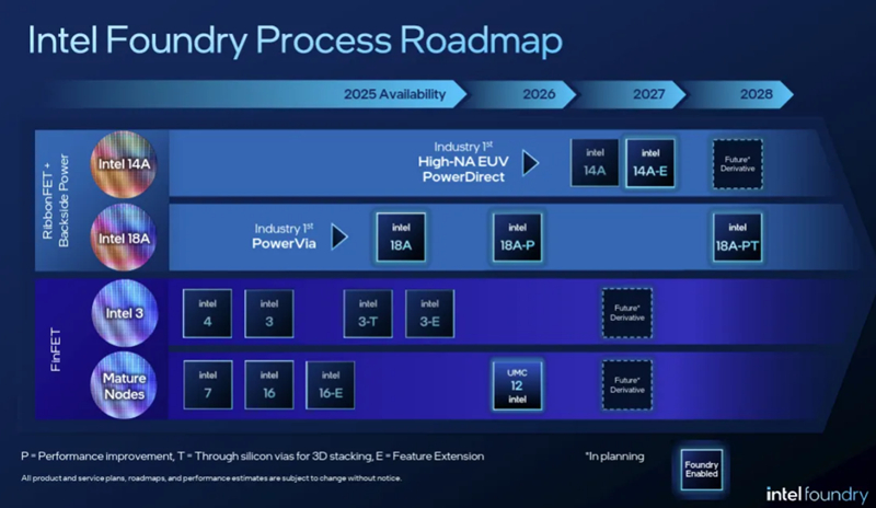 根据英特尔的官方路线图,18A-P 将在 2026 年推出,18A-PT 要等到 2028 年。此外,14A 将在 2027 年到来,还会有 14A-E 工艺。