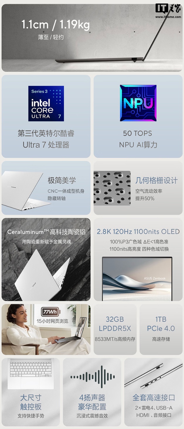 华硕 灵耀14Air 2026在屏幕方面配备14寸 2.8K OLED面板 120Hz刷新率 0.2ms响应时间,覆盖100% DCI-P3广色域,支持HDR10与杜比视界,呈现细腻色彩与明暗层次,适合视觉创作与影音娱乐。散热系统采用双风扇 双热管智能调控,依据负载动态分配风量,兼顾静音与性能释放,避免长时间高负载下的降频现象。接口提供USB-C 雷电4 HDMI 2.1 USB-A 3.2 microSD读卡器,可连接多类型外设与高分辨率显示设备,增强扩展灵活性,契合多场景接入需求。