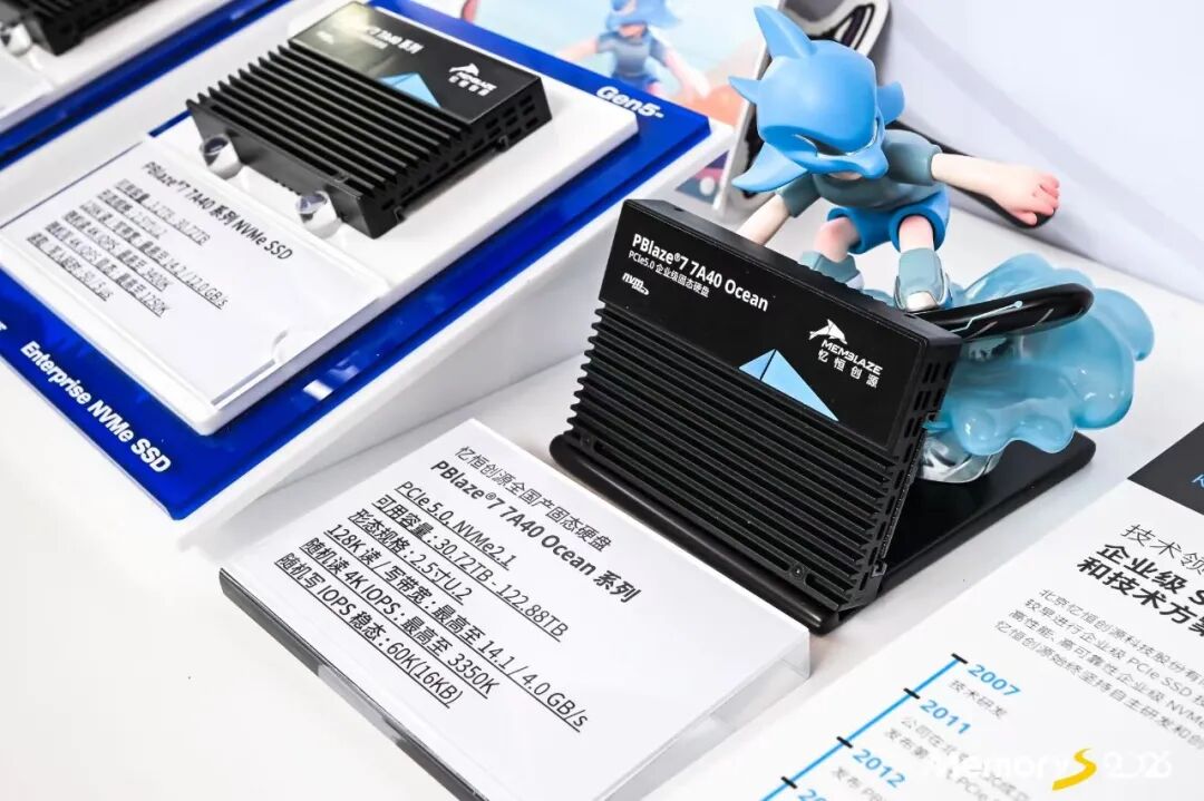 忆恒创源(Memblaze)推出了PBlaze7 7A40系列企业级NVMe SSD,这是一款支持PCIe 5.0接口的高性能固态硬盘。该系列采用平头哥镇岳510主控与长江存储晶栈 Xtacking 3D TLC NAND,是忆恒创源首款从硬件到固件全面国产的企业级PCIe 5.0 SSD。在忆恒自研MemSpeed 5.0技术合集优化下,可带来高达3,300K IOPS的4K随机读性能,高达1,000K IOPS的稳态4K随机写性能。其顺序读写性能分别为14.1GB/s和11.2GB/s,延迟低至55/5 μs,能效比相比前代产品有显著提升。